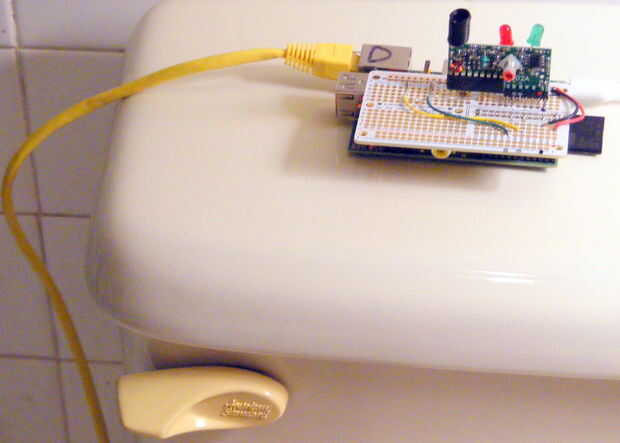 ¿Cómo funciona? – Un interruptor de flotador del sensor llano líquido de acuario detecta nivel de tanque de inodoro; descarga baja el nivel cierre el interruptor. Una célula de foto situada en zócalo (agujero ciego) del brazo de montaje de papel higiénico titular del huso detecta cuando el husillo se retira para cambiar el papel de tocador (dejando hits luz la célula fotoeléctrica, "cerrando el interruptor").