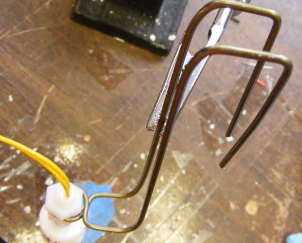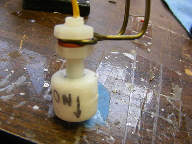 Construir - curva una percha en un flotador interruptor soporte como se muestra. El soporte debe colocar el interruptor de la pared lateral de tanque de inodoro y colgar hacia abajo lo suficiente para el interruptor de flotador anillo es completamente para arriba cuando el inodoro esté "sin agua". Soporte de la posición a lo largo de la pared posterior del tanque por lo que no interfiere con nada. Interruptor y soporte seguro lleva a la pared del tanque superior con cinta pato.