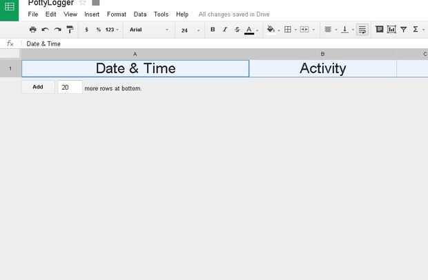Tienes que hacer casi lo mismo excepto el nombre de la hoja de cálculo es "Potty_logger" y la hoja de cálculo sólo tiene dos columnas: "Fecha y hora" y "Actividad"