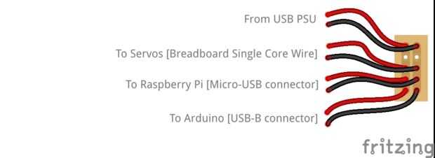 Los servos de 9g pueden ser pequeños, pero los motores aún demanda una alta explosión de corriente (en el inicio de un movimiento) que es bastante exigente y no es ideal para el carril de alimentación de 5v en la placa Arduino. En este paso, vamos a hacer un simple tablero de distribución de poder, que será fuente de alimentación de 5v de la PSU USB directamente al Raspberry Pi, Arduino y Servos.