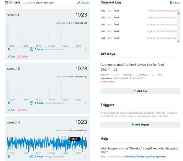 Para el software, hay muchas maneras de configurar las cosas. Arduino tiene código para crear un servidor web pequeño y otro código a leer esto, por lo que se puede hacer localmente. O, como en este ejemplo, podemos subir a la nube y descargar en cualquier lugar hay es internet o wifi. Este ejemplo utiliza Xively y su sitio mostrará los datos en un formato gráfico. Este código Lee los valores analógicos de 5, carga, Lee nuevamente y extrae los valores reales de la secuencia de texto Xively. Xively es gratis, y usted necesita una cuenta. Inicie sesión y haga clic en desarrollo. Haga clic en Agregar dispositivo y hay dos números. El primero es el dispositivo de alimentación a número que es alrededor de 9 números. Entonces es el API key que es un número más con números y letras. Copiar y pegar en el código. Luego agregar algunos canales – este proyecto utiliza cinco canales y les llamé Sensor1, Sensor2 etc..