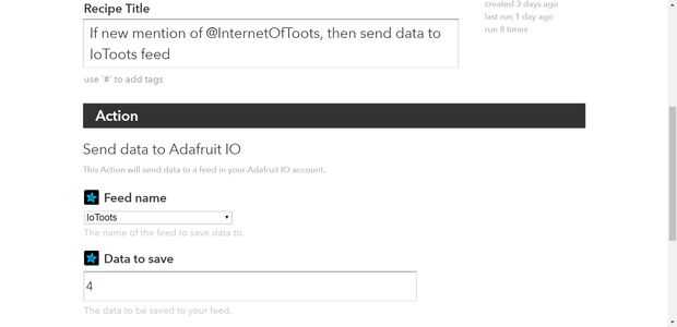 Podrá configurar y conectar tres servicios diferentes para hacer este trabajo: Twitter, IFTTT (si esta entonces que) y Adafruit.io. A utilizar éstos para crear un flujo de trabajo básico para que cada vez que un tweet menciona su cuenta Internet de Toots, IFTTT envía que un punto de datos a Adafruit.io y, a continuación, el dispositivo de la IoT puede comprobar Adafruit.io cada pocos segundos para ver si hay cualquier nuevos puntos de datos y responder a nuevos datos punto de tooting.