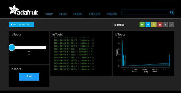 tienen uno. Crear un canal llamado "IoToots" en su cuenta de adafruit.io. Crear un tablero de instrumentos que puede utilizar para la prueba que contiene este alimento "IoToots". Configurar mina con un slider que puede cambiarse a valores entre 0 y 4 a la prueba, pero no necesita esto si todo funciona perfectamente la primera vez (nunca pasar?). Adafrut.IO está en fase beta pero es un servicio de Internet bonito, fácil de usar hasta ahora. Más instrucciones detalladas para configurar una cuenta de Adafruit.io, alimentación y tablero de instrumentos están aquí: https://learn.adafruit.com/adafruit-io-basics-feeds