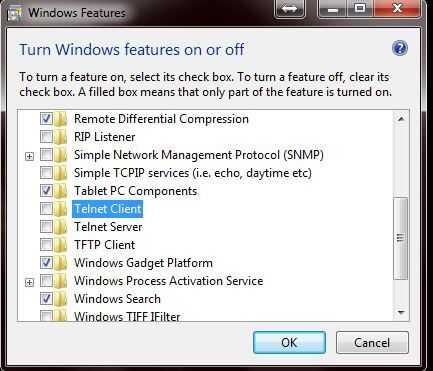 Goto Start Menú === > Panel de Control == > programas y características === > Windows características en o desactivar (barra lateral) luego navegar hasta Telnet cliente y marque la casilla. Cerrar todas las ventanas