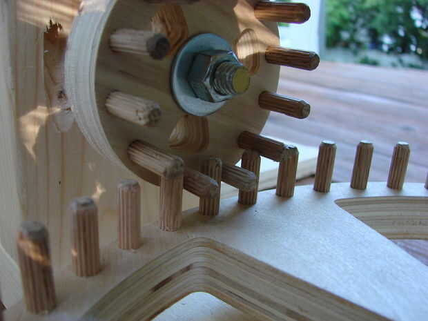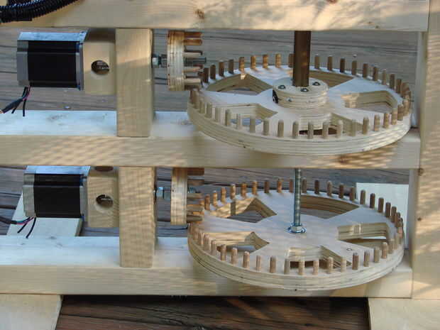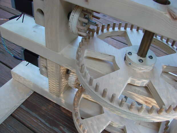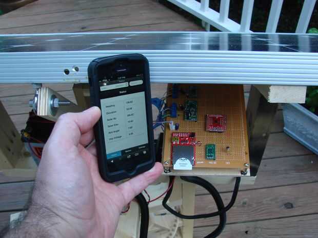 Se trata de un seguidor Solar. Un tamaño completo, nube conectada, smartphone accesible rastreador Solar construido principalmente de 2x4s y madera contrachapada, empleando madera peg engranajes, postes de la cortina reciclada, tuercas, pernos y varilla roscada. El seguidor solar utiliza un hogar construido controlador electrónico incorpora WiFi, impulsiones del motor paso a paso, acelerómetro y magnetómetro. El tracker fue diseñado para manejar un panel de tamaño completo 90W en Azimut y elevación. Los engranajes conduce el tracker son engranajes de la clavija de madera utilizados en el siglo XVI. Los engranajes fueron diseñados con modernos CAD 3D (Solidworks). Conexión de los engranajes de la clavija de madera a la nube sólo parecía lo correcto. Este no es un diseño resistente al agua, usted necesitará considerar modificaciones en su diseño derivado a prueba de agua.