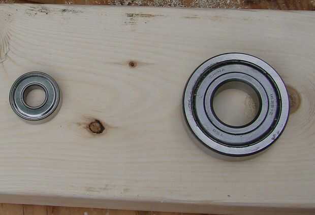 - Rodamientos 3/8", tendrá siete 3/8 ID por rodamientos de 7/8 OD. Rodamientos sellados son mejores para mantener la humedad y el polvo hacia fuera. Cojinete para la operación de todo tipo de clima es una funda de plástico cojinete o rodamiento de rodillos. Utiliza rodamientos de acero baratos que no pueden hacer frente a un uso prolongado al aire libre sin impermeabilización pero yo ya los tenia en mi caja de cosas de una vieja construcción de máquina CNC usé lo que tenía. He utilizado 7 de ellos. VXB, mina de oro electrónico y uso Enco.com son buenas fuentes para los rodamientos de bajo costo. Electrónico Goldmine dispone de 3/8 ID rodamientos para menores $1 cada uno. VXB tiene cojinetes de plástico y cerámica.