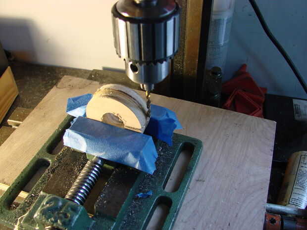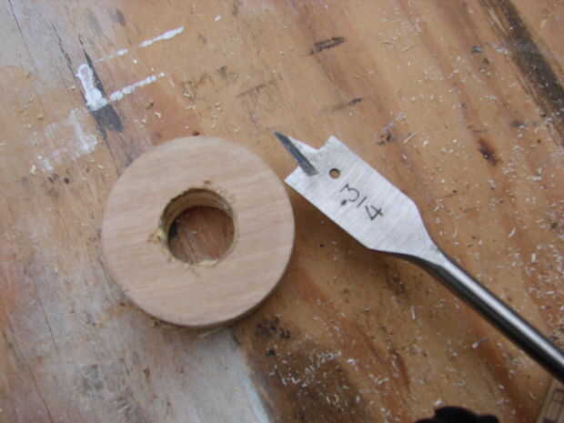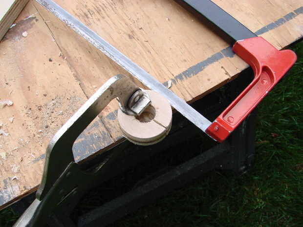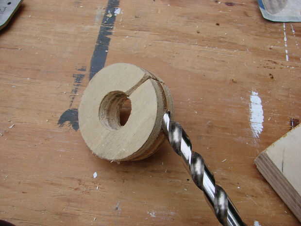 La barra de la cortina se fija a la marcha usando una abrazadera de collar madera cortada la madera 0,75". La fabricación de la abrazadera comienza por un disco de 2" de la madera contrachapada del corte con una sierra del agujero 2". Si usted tiene un agujero más grande vio, (decir 3") utilice. La pinza más pequeña tiende a dividir. Una vez que han cortado el disco hacia fuera, fíjela a la superficie de trabajo y use un 0,75" espada o broca Forstner para cortar un agujero a través. La barra de cortina pasará a través de este agujero y luego fijarse en el engranaje. Usando una sierra para metales, corte una hendidura en la abrazadera. Luego perfore un agujero para el tornillo de sujeción. He utilizado un tornillo Kreg asi el agujero piloto se hizo con un 1/16" bits.