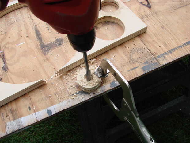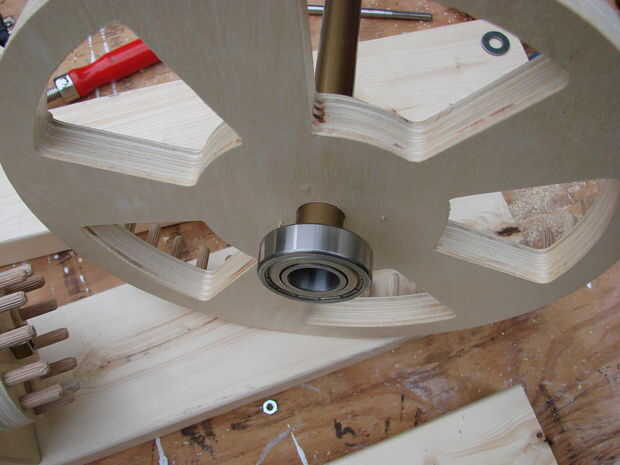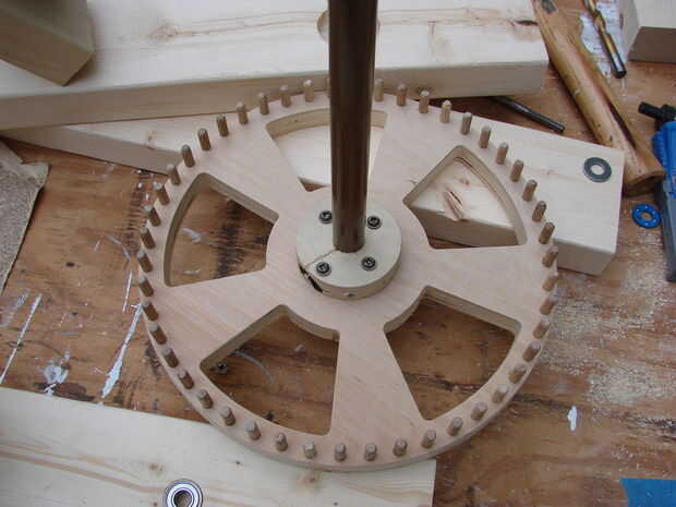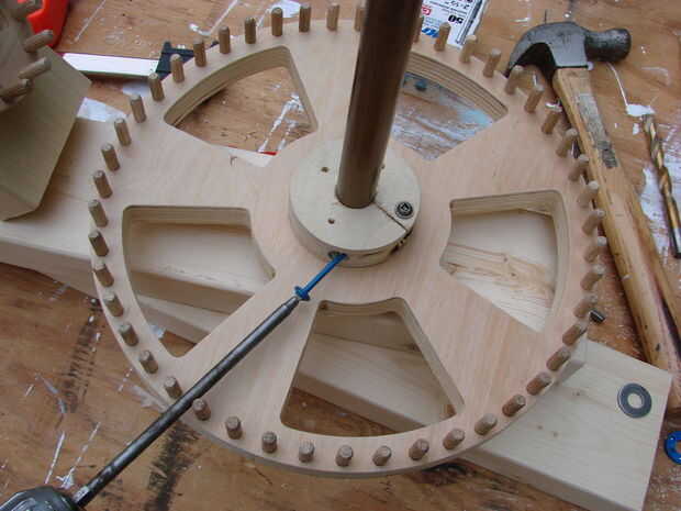 Después de taladrar el agujero piloto, solía el Kreg broca contra agujero el que hay una superficie plana para hombro el tornillo de sujeción. Para impedir que partir cuando se atornilla el tornillo de fijación en la madera, utilizar un solo tornillo Kreg para unir la madera primero, antes de apretar el tornillo de sujeción. Una vez que la abrazadera está apretada, utilice 3 1 ¼" Kreg tornillos adicionales para fijar la brida en el engranaje como se muestra. El cojinete grande es un ajuste apretado en la varilla de cortina, utilice un martillo para conseguir en lo suficiente para que se mantiene perpendicular.
