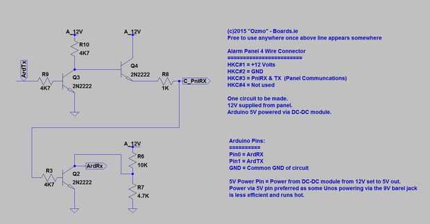 Así que tenemos un circuito que dividir esto en dos separados RX y TX para Arduino, así como realizar la conversión de voltaje entre 5V y 12V. La señal se invierte también a cómo el Arduino tiene gusto de él. El circuito también debe ser capaz de desconectar del bus cuando no su turno para hablar - con el fin de no interferir con el funcionamiento de los otros teclados en el autobús. Traté en lo posible utilizar las mismas piezas para hacer compras más fácil - tan por ejemplo los tres Transistores son todos idénticos.