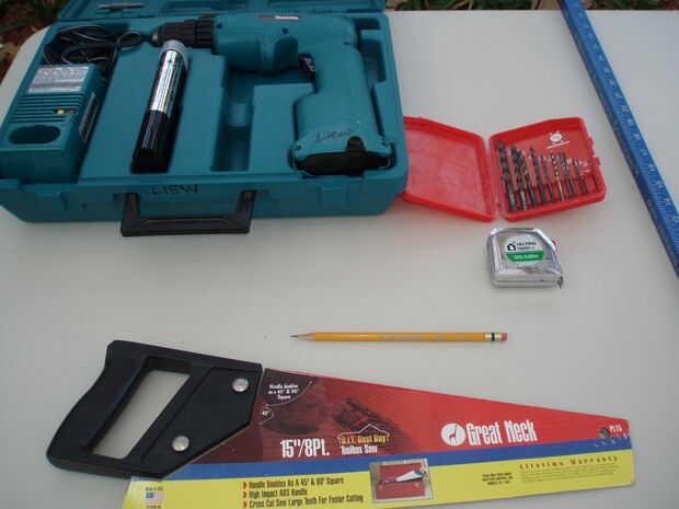 taladro, brocas, Sierra de mano, regla, cinta métrica y por supuesto un lápiz.