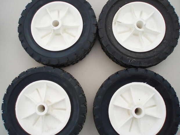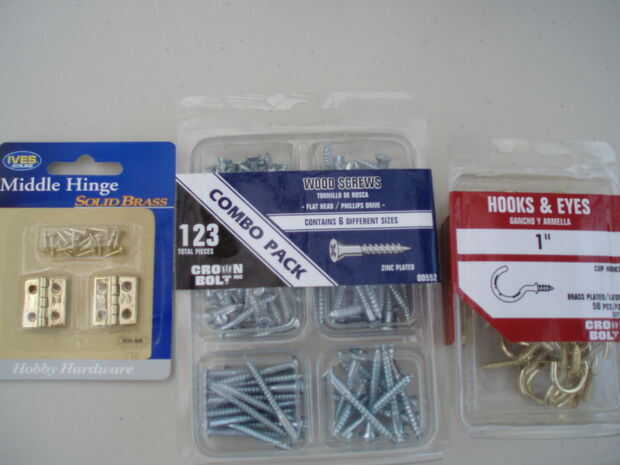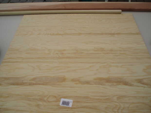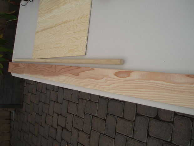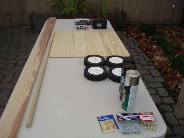 Un pedazo de madera contrachapada (para la plataforma del chasis), un árbol (lo que se puede trabajar con madera y cobre), un tablón de madera que solía trabajar con para las varias piezas de la carreta, cuatro ruedas de la cortadora de césped, algunos tornillos de madera y ganchos (para anclar la cortarla).