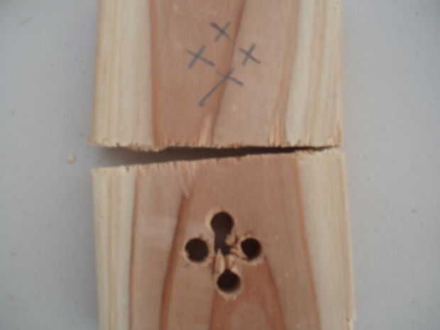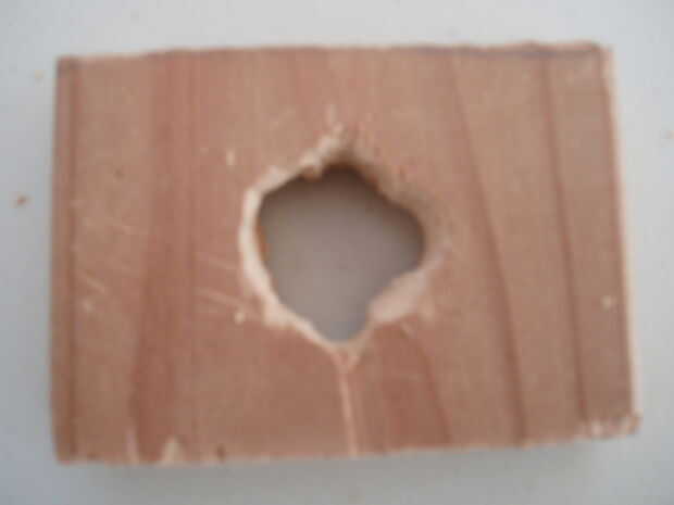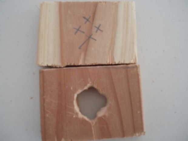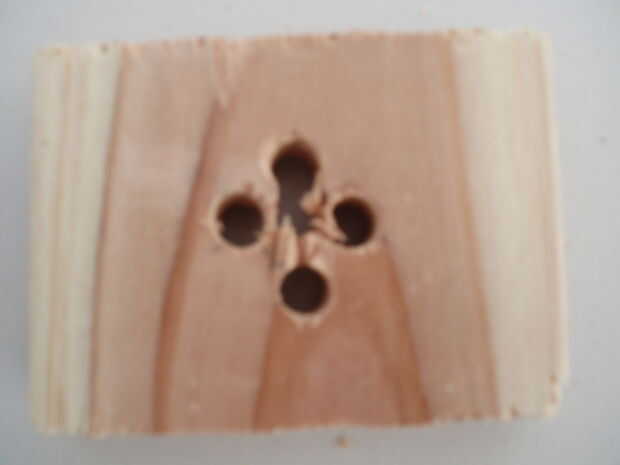 Y ya que tengo un poco lo suficientemente grande como para perforar un agujero que el eje de madera, tengo que cortar varios agujeros y la moda un círculo muy áspero de un pequeño bloque de madera.
