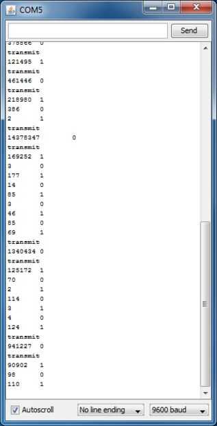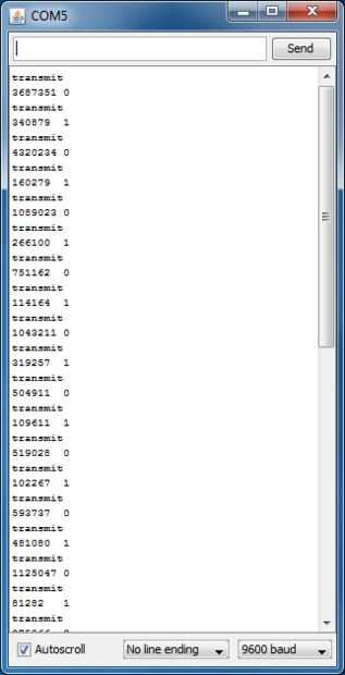 Eso es lo que estás viendo aparecer en pantalla. Cada vez que la línea de "transmitir" aparece, es el comienzo de un nuevo volcado de datos de la placa. En general, para cada borde ascendente y descendente, la Junta encuentra tiempo para transmitir entre interrupciones, pero que no está garantizada.