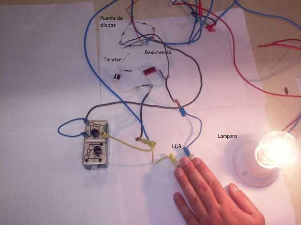 Hemos conectado un puente de diodos, seguidos de una resistencia en serie con un condensador. En paralelo con una LDR seguido de un tiristor. Seguidamente hemos conectado una bombilla cuando no detecta la presencia de luz solar se enciende, hasta vuelva ha detectar luz otra vez de nuevo y se apague.