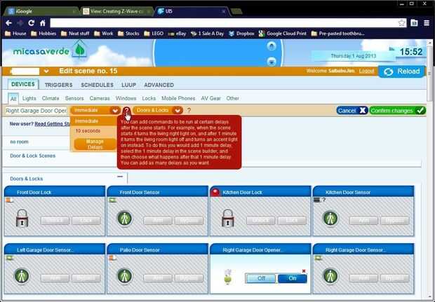 Para abrir su puerta de garaje que sólo quiere activar el interruptor durante unos segundos (como pulsar el botón de abrepuertas de garaje), luego apáguelo (soltar el botón). Crear una nueva escena donde se activa el interruptor. Agregar un retraso--aquí se puede ver establece en 10 segundos. Haga clic en ese retraso y el interruptor. Cada vez que se ejecuta la escena, el interruptor se encenderá, pausa, luego se apagará.