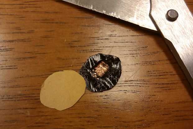 Pelar el forro de uno de los círculos de papel y usar el borde de las tijeras para chatarra a un pequeño parche adhesivo en el centro.  Utilizando una hoja de papel con un negro de respaldo le permite más fácilmente lo que ha sido raspada claro.