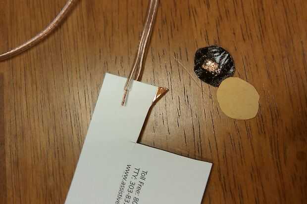 Voltee la tarjeta y repita los pasos 3-6 para el otro lado.  Pelar el forro del otro círculo de papel de aluminio, escape un pequeño parche adhesivo y usar el círculo para conectar el segundo cable principal hacia el lado opuesto de la tarjeta.  Una vez más, asegúrese de que el remiendo pelado de papel toca el cable pelado, y algunos de plástico aislante del cable se superpone.
