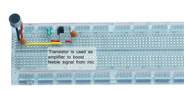 La señal que sale del micrófono es demasiado débil para ser utilizado para cualquier cosa, por lo tanto, necesitamos otra etapa de amplificación. La señal que sale del micrófono es poco más que 160mv. El voltaje de la señal que sale del micrófono no puede utilizarse para algo útil como tensión base mínima necesaria para activar un transistor es 600mv (0.6 v) por lo tanto se necesita otra etapa para amplificar la señal. En esta etapa que se amplifica la señal, usando BJT (Bipolar Junction Transistor) para amplificar la débil señal. Aquí se utiliza el transistor como un amplificador. Te digo el cuento largo corto, el transistor tiene dos funcionamiento como amplificador de otro como un interruptor. Aquí estamos forzando deliberadamente al transistor para ser utilizado para propósito de amplificación, por una cosa llamada polarización, regulando la cantidad de base actuales podemos forzar el transistor como un amplificador, para más información consultar cualquier libro de curso de pregrado electrónica.