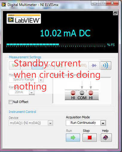 Cuando clap interruptor circuito está encendido y no está produciendo ninguna salida es decir ambos LED y zumbador son apagado (modo espera). La corriente consumida por el circuito es de 10 mA (véase la primera imagen arriba). Voltaje de funcionamiento del circuito es 9v. Tan energía (P = V * I) consumida por el circuito es de 10 m * 9v = 90mWatt.
