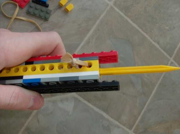 aquí es una manera fácil de hacer un cuchillo de LegoPaso 1: piezasPaso 2: manejar Poner el ladrillo amarillo dentro de la pieza negraPaso 3: Añadir dos delgadas Lego ladrillos debajo del ladrillo amarillo y luego añadir la pieza negra debajo de las