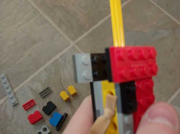 aquí es una manera fácil de hacer un cuchillo de LegoPaso 1: piezasPaso 2: manejar Poner el ladrillo amarillo dentro de la pieza negraPaso 3: Añadir dos delgadas Lego ladrillos debajo del ladrillo amarillo y luego añadir la pieza negra debajo de las