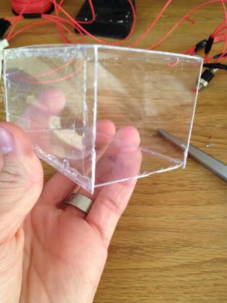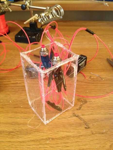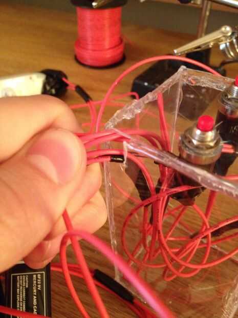 Hice 2 agujeros pequeños para mis interruptores de empuje mostrar a través de. Después de eso hice un agujero para los cables a.