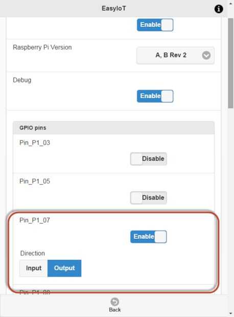Ir en el navegador WEB en Computadoras y tipo FRAMBUESA Pi IP dirección (equipo que debe instalarse en la misma red como Raspberry Pi). Utilizar nombre de usuario admin y la contraseña de prueba cuando se le preguntó. Vaya a Configuración -> Drivers -> controlador de frambuesa Pi y habilitar el controlador. Asegúrese de seleccionar la versión correcta de tablero Raspbery Pi. A continuación permiten Pin_P1_07 como salida.