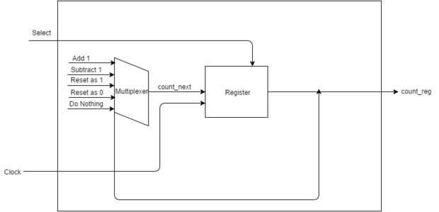 El contador realiza un seguimiento de ambos la cuenta actual y seleccione un valor, llamado, que determina cómo va a cambiar la cuenta con el siguiente ciclo de reloj. Si el contador va hacia arriba o hacia abajo será dictado por la señal de selección. Hemos creado la señal de count_next iguales a la count_reg + 1 o count_reg -1, dependiendo de la señal de selección. Además, el contador puede también restablecer a 1 o 0 para apagar manualmente la luz encendido o apagado.