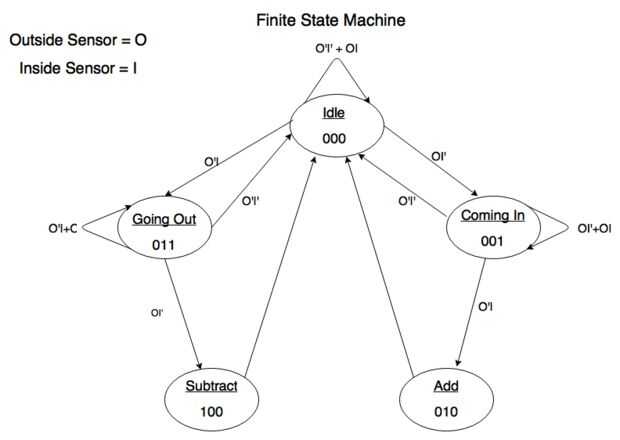 Este módulo interpreta los datos de los sensores para decidir la señal select utilizada por el contador. Los Estados son los siguientes: inactivo, saliendo, entrando, sumar y restar. Cuando se activa el sensor externo, el estado las transiciones a "venir en" anticipación del interior sensor está activado. Cuando el interior sensor es activado desde allí el estado va a "agregar". Trabajo de las transiciones de estado "saliendo" del mismo modo, sólo con los sensores volteado. Estos Estados muestran ya sea sumar o restar el número de personas. Consulte el diagrama de estado si usted tiene preguntas acerca de las transiciones de estado.