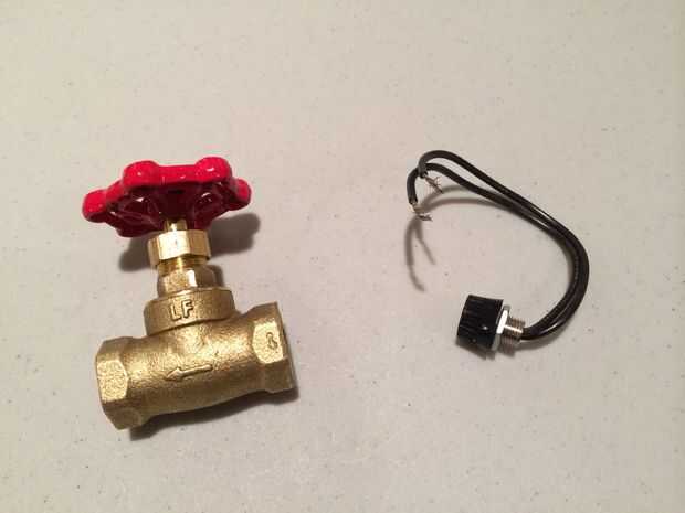 Para mi interruptor de válvula de agua utilicé un Mueller Industries, prolina cierre válvula (105-003NL) y un interruptor rotatorio de Carling Technologies R-135-BL 1/2". Encontré el interruptor en Grainger.com y había recogido en un centro local cercano me de $6,25. Más tarde vi que Lowes tiene un interruptor muy similar que parece ser del mismo tamaño de poco más de $3. Este interruptor puede manejar 3 amperios a 120 v o 5 amperios a 12V. Ciclos a través de en/off en sentido horario cada cuarto de vuelta. La válvula de agua era un elemento surtido en una ferretería Ace por unos US $9 pero Lowes tiene demasiado. Mientras escribo esto, no puedo encontrar en la Página Web de Lowes, pero sé que son un elemento típicamente surtido. No conseguir una válvula de compuerta. Usted necesita el tipo representado en la corte donde el agua entra, va a través de un agujero vertical y por el otro lado. El ajuste es muy ajustado en la válvula de 1/2". Si no te importa usar una válvula de 3/4", será mucho más fácil todo ajuste, pero puede ser que necesite algunos epoxy mantiene todo en su lugar.