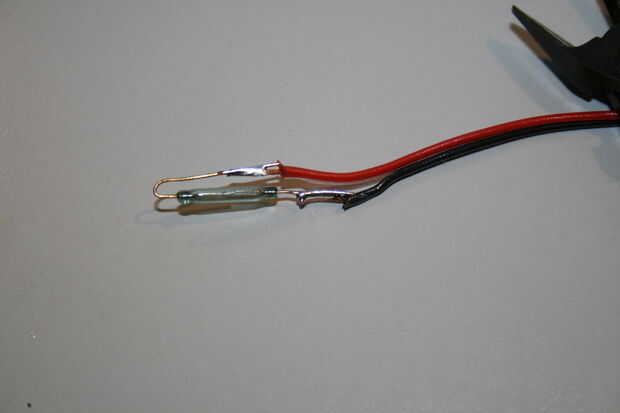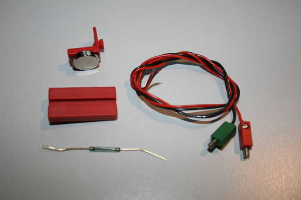 Interruptores Reed están disponibles por poco dinero en el comercio de electrónica. Dependiendo de la finalidad tiene que seleccionar el voltaje permitido y la corriente. 2 una alimentación de la conmutación debe ser suficiente en el entorno de juguete.