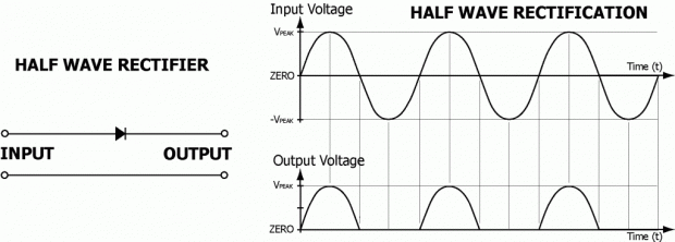 ¿Cómo funciona? La rejilla de la energía en América del norte entrega corriente alterna electricidad a hogares y negocios a una frecuencia de 60 hertz (ciclos por segundo), y cuando esta energía se representa visualmente, tiene una forma de onda conocida como una onda sinusoidal. Esto significa que 60 veces por segundo la dirección que la electricidad es corriente alterna. Un diodo es un componente eléctrico que actúa como una válvula unidireccional y permite sólo energía eléctrica fluyendo de una forma a través de él. Cuando un diodo solo se instala en un alambre con corriente alterna a una carga, como una lámpara incandescente, que sólo permite aproximadamente la mitad de la potencia para llegar a la luz. Cuando se analiza esta forma de onda rectificada, la mitad de la onda senoidal será falta porque está siendo bloqueado por el diodo.