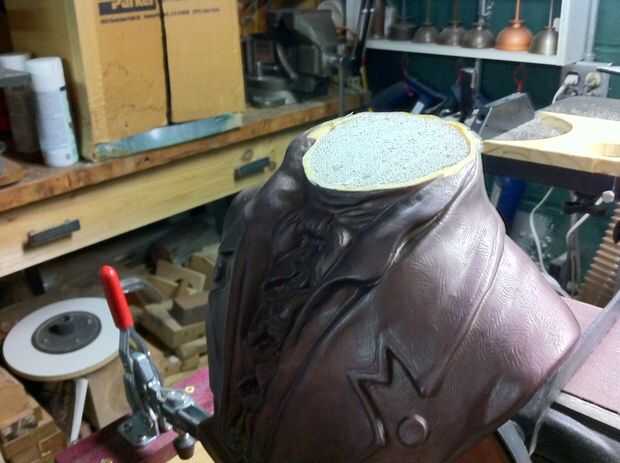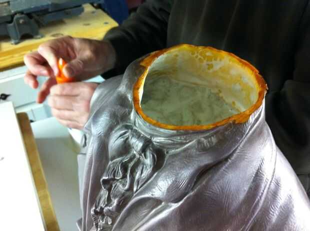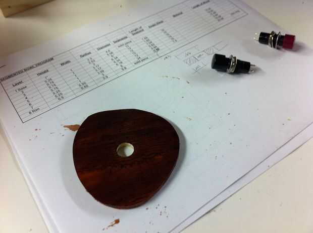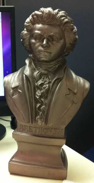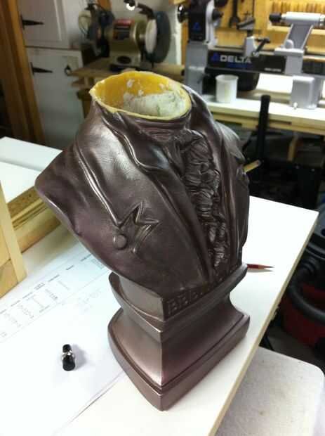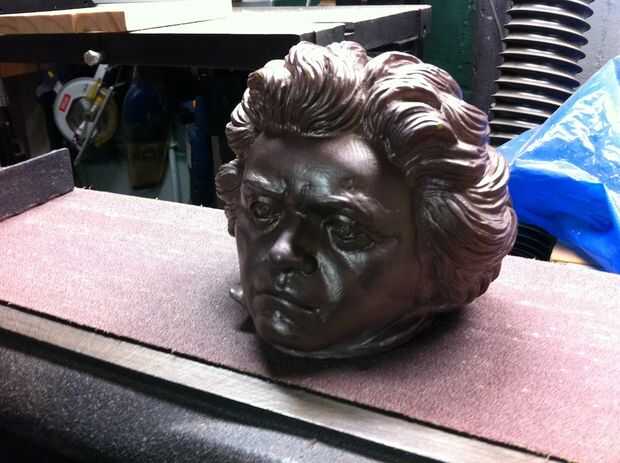 Como todos buenos proyectos este uno comenzó con el corte con una sierra de banda de la cabeza de alguien. En este caso Ludwig van Beethoven fue el desafortunada alma tener la cabeza separada de su cuerpo. De lo que puedo decir, la cáscara externa dura era una fibra de vidrio como material mientras que el interior era un vertido yeso poroso. El yeso creado un lío tremendo pero era bastante fácil cincele para hacer espacio para la electrónica. Después de picar, le di el yeso una buena capa de pegamento de Elmer para reducir la cantidad de polvo de yeso que se escapa de orificios de Ludwig. También corte y teñido de una pieza de contrachapado para actuar como un soporte para el botón y ocultar el yeso.