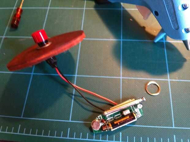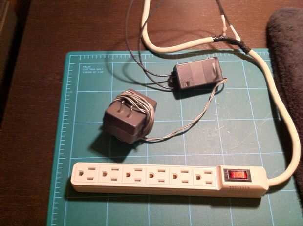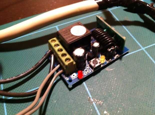 El siguiente paso era encontrar una fuente de alimentación 12v barato para conducir el Relais. Usé una vieja fuente de alimentación que tenía por ahí, también cogí una regleta de 6 enchufe barato y quitado de la pantalla exterior para cortar en la línea positiva (120v). Esto era extendido y conectado a la placa de relé. Además me quitan el mando a distancia inalámbrico de plástico su carcasa y soldar el pulsador de la PCB. Después de montar el pulsador de la cubierta de madera contrachapada agregué una capa extra de pegamento caliente alrededor de todas las conexiones para mayor apoyo, incluyendo la batería del mando a distancia.