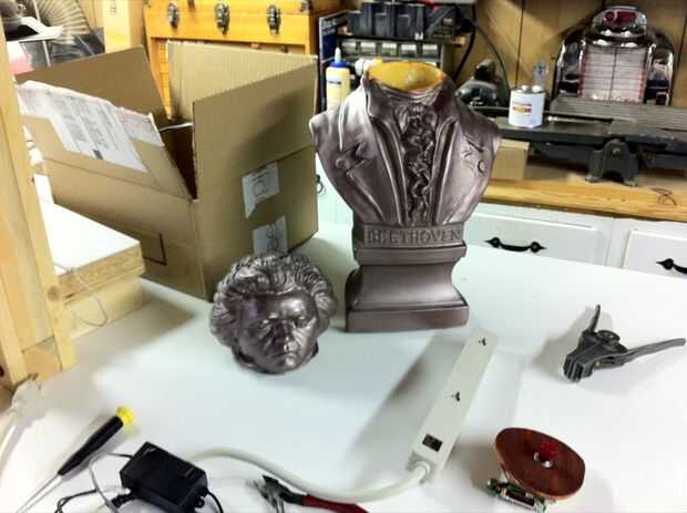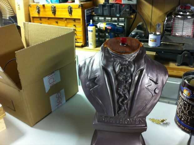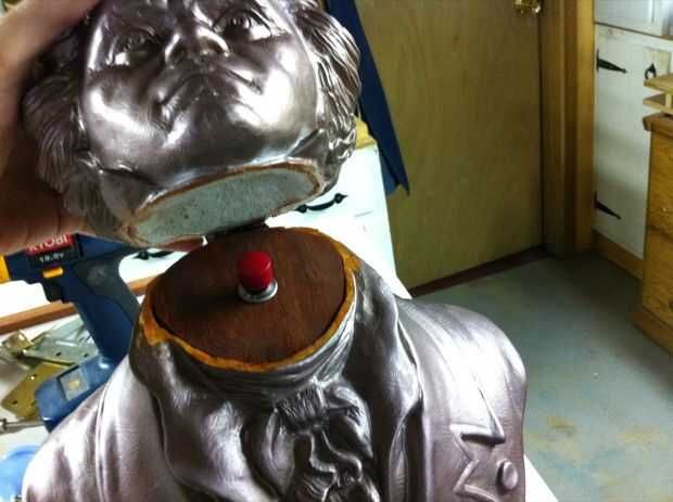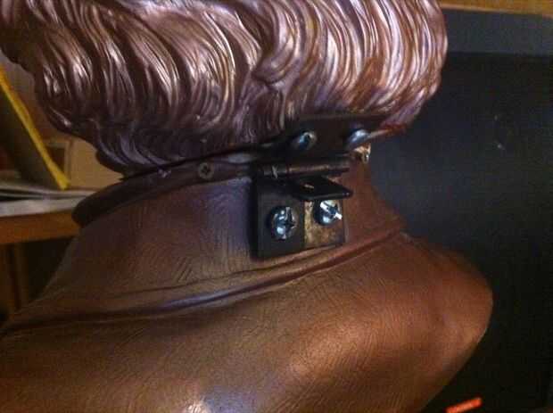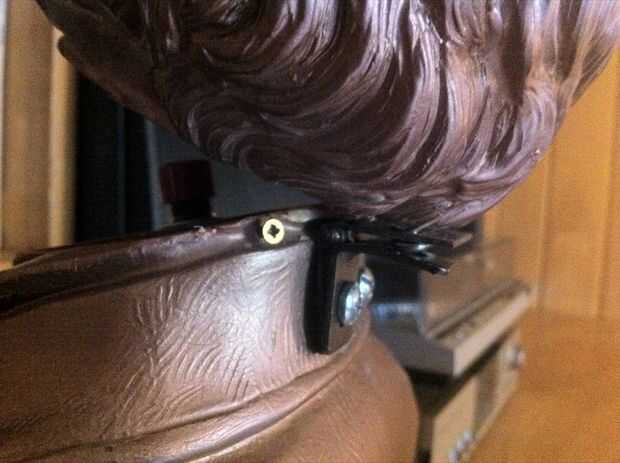 El último paso fue montar la electrónica dentro del cuerpo y colocar la cabeza sobre una bisagra. No había demasiado para esta parte, sólo algunos agujeros perforados y utiliza antiguos soportes, bisagras, tornillos y tuercas para sujetar todo en su lugar.