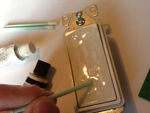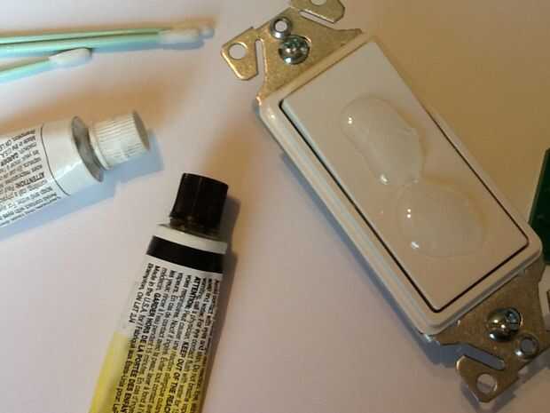 Ahora, aplicar la resina de epoxy y el endurecedor (las dos partes de epoxy).. Esto es generalmente realizado en una mezcla de Fifty-Fifty, pero Lea las instrucciones de su epóxido. Para aplicación de apliqué y mezclar el epoxi directamente en el interruptor de la luz. Esto elimina los residuos de mezcla y aplicando, pero usted necesita ser cuidado de no aplicar demasiado. Demasiado el epoxi puede filtrarse a los lados y fusibles el interruptor de la luz. Un interruptor de una sola etapa es un switch con ningún propósito en la vida. Qué triste.