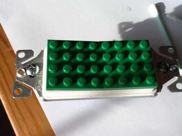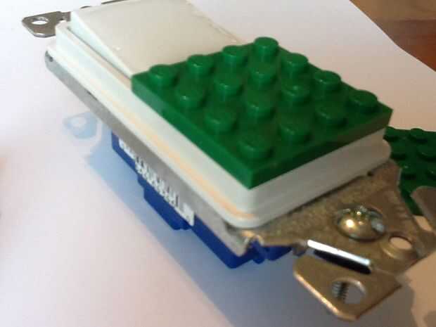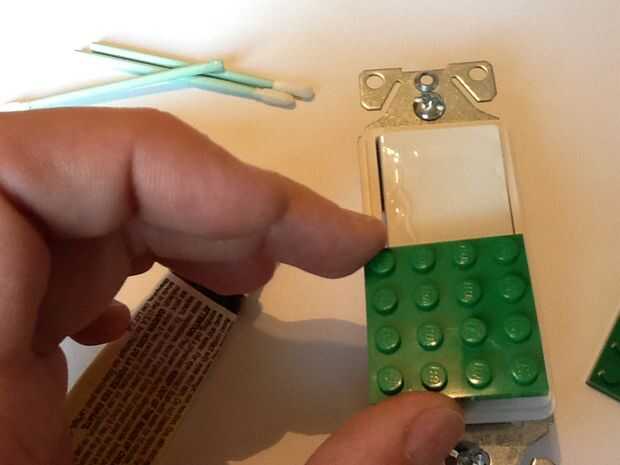 Ahora coge la otra placa LEGO y coloque firmemente en la parte superior del interruptor, la parte de ON. Esto probablemente cambie la placa inferior, así realinear y la placa inferior cuadrado y luego alinee la placa superior a la placa inferior.