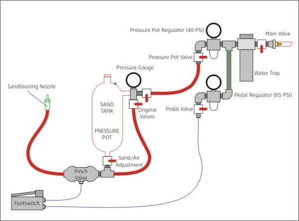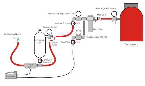 La primera ruta va a través de un regulador para obtener 40 PSI para el recipiente a presión, luego entra un separador de donde parte la guarda la olla bajo presión y el otro pasa por debajo de una válvula mezcladora donde recoge arena y pasa a través de la válvula de pellizco. Desde allí dirige a la boquilla de chorro de arena. El bote del puerto de carga tiene dos válvulas que se utilizan normalmente para controlar cuando no se tiene un control de pedal. Dejé estas en el lugar, pero si tuviera que hacerlo otra vez... Usar en el colector y ahorrar los $7 cada uno para los que conseguí en Lowes. (Debido a la Asamblea de interruptor de pedal ellos ya no son necesarios donde se montan actualmente.)