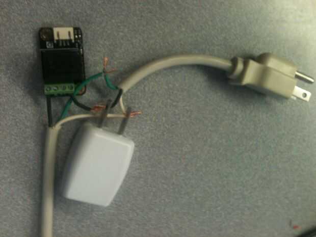utilizando el extremo del cable que se enchufa en la pared, conecte el cable negro y el pedazo negro corto a una pierna del bloque USB. Conecte los cables blancos desde ambos extremos del cable a la otra pata del bloque USB. conectan los alambres verdes para que no toquen ninguna parte del bloque de USB. Conecte el cable negro corto en la cabecera de COM en el relé. Conecte el cable negro del otro poder cable extremo (el extremo que le aplicará su aparato) en la cabecera NO el relé. cinta los cables pelados y termina el bloque USB para evitar el contacto accidental con los cables y te.