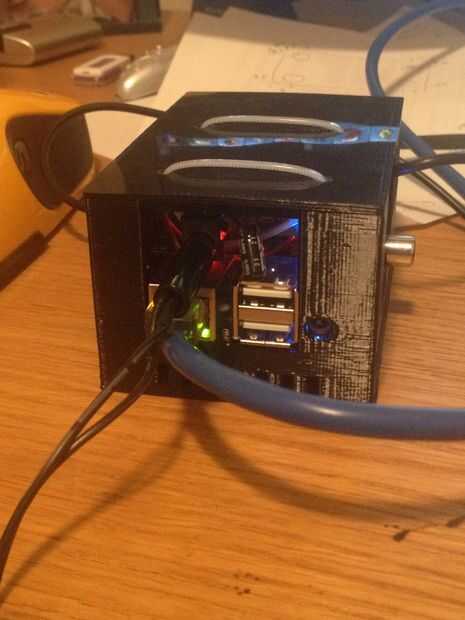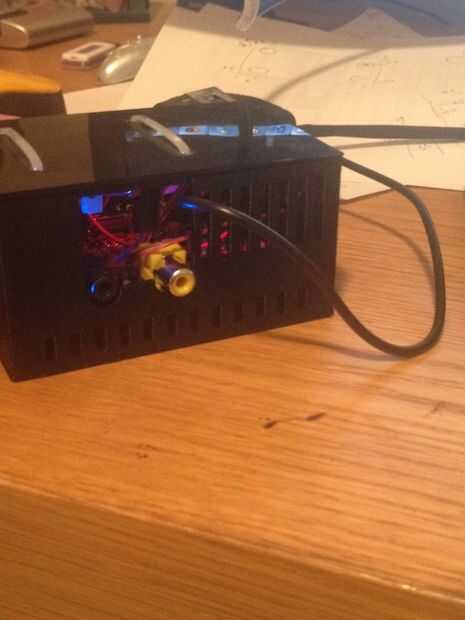 Una vez que el caso se imprime, inserte el Pi de plátano en el caso. Conecte el circuito de alimentación a la parte superior de la caja. Lo hice cuatro agujeros y usando zip lazos para mantener en su lugar. Asegúrese de colocar el circuito para que el enchufe de entrada se encuentra justo encima de la Ethernet y USB se conecta para que se lo puede introducir fácilmente (ver imagen). El cable que va desde el enchufe de la salida en el circuito de alimentación al conector de usb en la Pi se puede encaminar hacia el lado de arriba la salida de vídeo compuesto (ver imagen). Por último conectar los pines GPIO0 y GPIO1 (pines 11 y 12) a los pines de jumper en el circuito de potencia. Asegúrese de que GPIO0 conecta a PB1 sobre el ATtiny y GPIO1 conecta con PB2. Con todo atado con alambre para arriba, poner la parte superior en el caso y enchufe en cualquier lugar que desee sin preocuparse de tener que reiniciarlo.