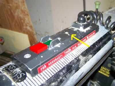 Ya no tengo un interruptor original, sino que se utiliza un programa para crear la imagen de un interruptor original en lugar de edición de fotos.  Tenía un botón rojo para detener la sierra y un botón verde para empezar la sierra.  La flecha amarilla apunte a un ojo de la cerradura para una llave de metal estampada utilizada para bloquear el interruptor para que la sierra no se enciende "" accidentalmente.  Lengüetas de metal flanquean el botón verde para evitar que accidentalmente lo golpea y encender la sierra "" cuando no.