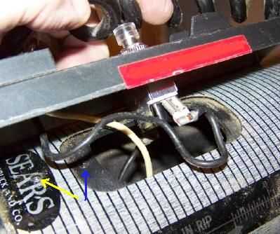 Para encontrar un lugar donde podía montar el nuevo interruptor, tuvo que dar vuelta el bastidor que sostiene el extremo del interruptor para el final.  El cuerpo del interruptor de nuevo tenía que caber en el agujero en el brazo de la Sierra de hierro fundido.  Uno de los hoyos de tornillo originales para montar el bastidor que contiene los interruptores está indicada por la flecha azul.  Tuve que desplace el bastidor un poco y hacer una nueva rosca como se muestra por la flecha amarilla.  Un nuevo agujero adicional tuvo que ser hecho en el otro extremo del bastidor, también.