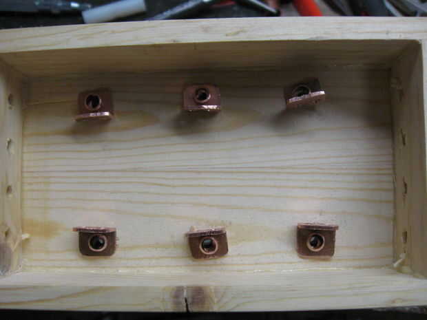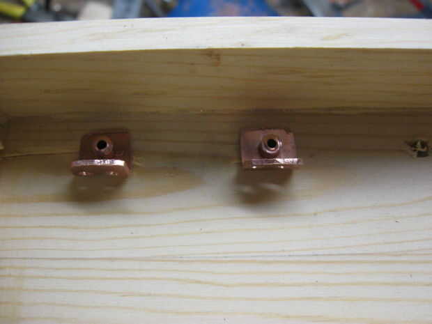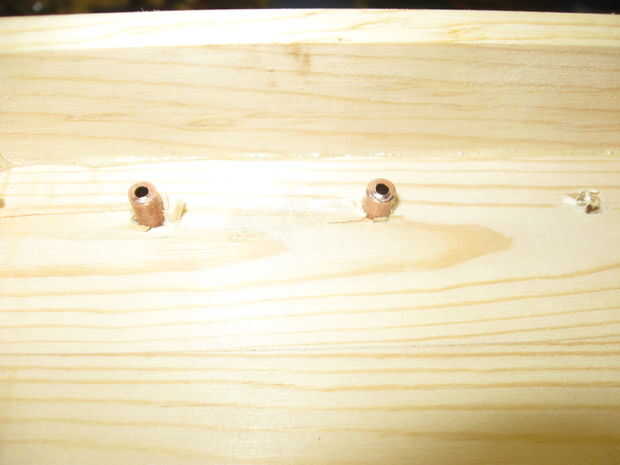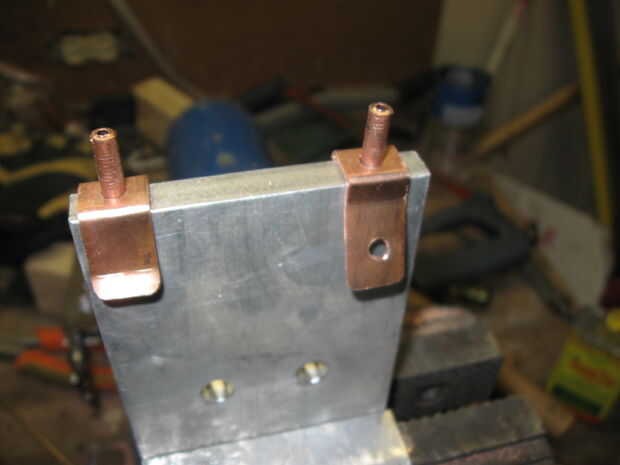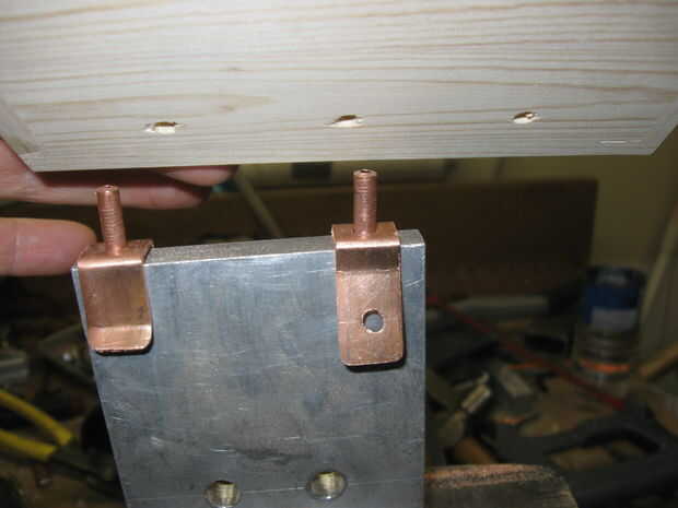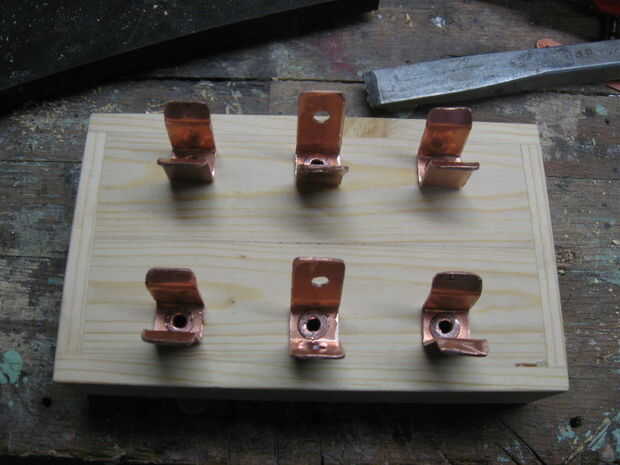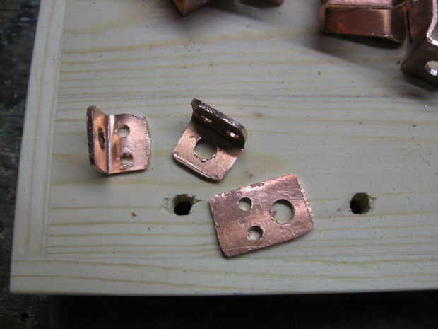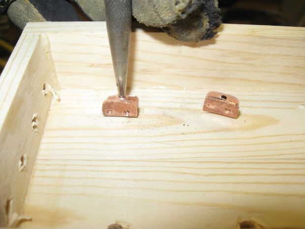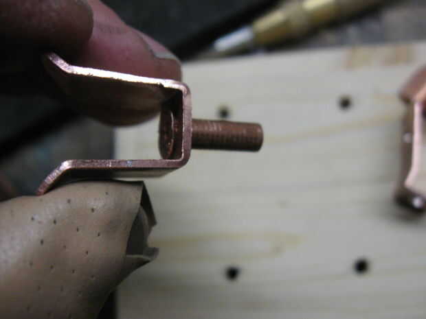 Los remaches están alineados con los contactos con un pedazo de tela gruesa de 3/8 de pulgada sujetada en un tornillo que actúa como un yunque para los remaches. Utilice un trozo lo suficientemente ancha como para 2 puntos consecutivos del remache a realizar, Esto alineará el contacto como sea necesario.