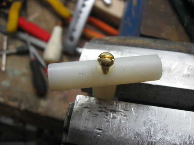 El mango está hecho de una sección de 2 pulgadas de la barra de nylon que se perfora para aceptar el perno 10/24 pulgadas. El centro de la varilla está Cruz perforados para aceptar un pequeño trozo de varilla de 1 pulgada nylon largo como un mango.