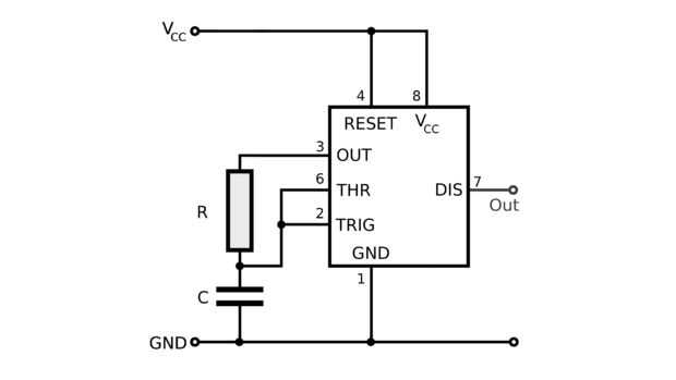 Puede alimentar el circuito con cualquier cosa de 4.5V a 18V. El tiempo es controlado por la resistencia y el condensador según la fórmula: