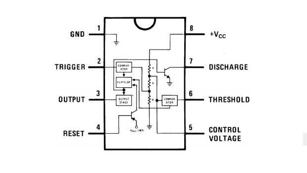 Este circuito es un poco diferente de circuitos regulares de Temporizador 555. El pin 3 se utiliza para carga y descarga del capacitor y el pin 7 es la salida. Elegí este diseño porque durante el ciclo de descarga pin 7 está en corto circuito a tierra a través de un transistor interno. Esto es lo ideal para activar el obturador de la cámara.