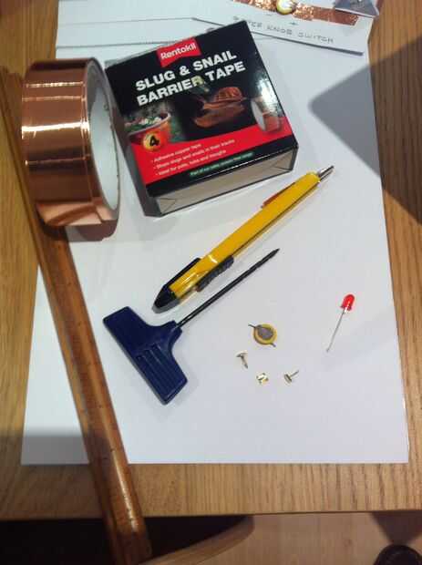 Cinta de cobre , usé Rentokil "Babosa y caracol barrera cinta" encontrado en tiendas de suministros de hogar y del jardín. Tenga en cuenta que el lado adhesivo no es tan conductora como la parte superior.