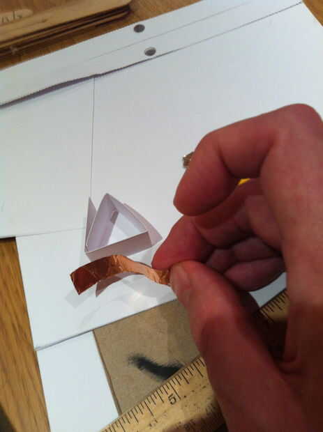 Doblar la tira de papel en un triángulo y acoplar un 3/8 "x 1" pieza de cinta de cobre en la parte inferior.