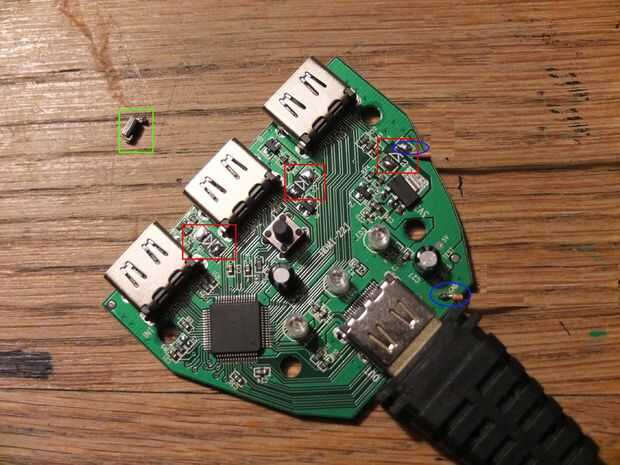 Quitar los diodos (uno se muestra marcado en verde) utilizando un soldador para sacar del tablero. Efectivamente deshabilita la Junta como el conmutador de que IC no puede obtener energía externa. Tenga en cuenta que la foto de este paso fue tomada después de que los diodos habían sido quitados.