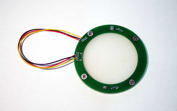 Alinee los agujeros de la PCB, la membrana de silicona y la parte que desea adjuntar el botón a. En nuestro caso, contamos con los agujeros ya en la caja de plástico de la lámpara, pero puede que tengas algo completamente diferente. Cuatro #6 tornillos para sujetar el botón con el caso. Asegúrese de que los tornillos son la longitud correcta basada en el espesor de la pieza de silicona y su PCB. Utilizamos 10mm (0,39") #6 tornillos para madera. También se pueden utilizados espaciadores si no puede encontrar los tornillos que son lo suficientemente cortos.
